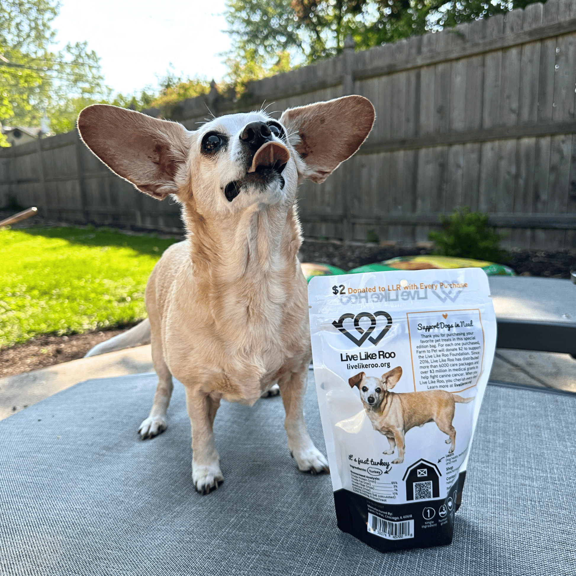 Farm to Pet Turkey Chips for dogs support pet wellness thanks to their simple wholesome nutrition. These US-made dog snacks made with all-natural turkey breast are ideal low-fat treats for dogs with chicken allergies and any pet who loves to gobble up turkey! Plus, this special-edition bag helps support the Live Like Roo Foundation in their mission to help dogs with cancer, as well. For every Live Like Roo bag you buy, Farm to Pet will donate $2 - and up to $15 for a 6-bag bundle - to help this fantastic Chicago-based pet charity fund canine cancer care for pet families in need. We both thank you for your support!